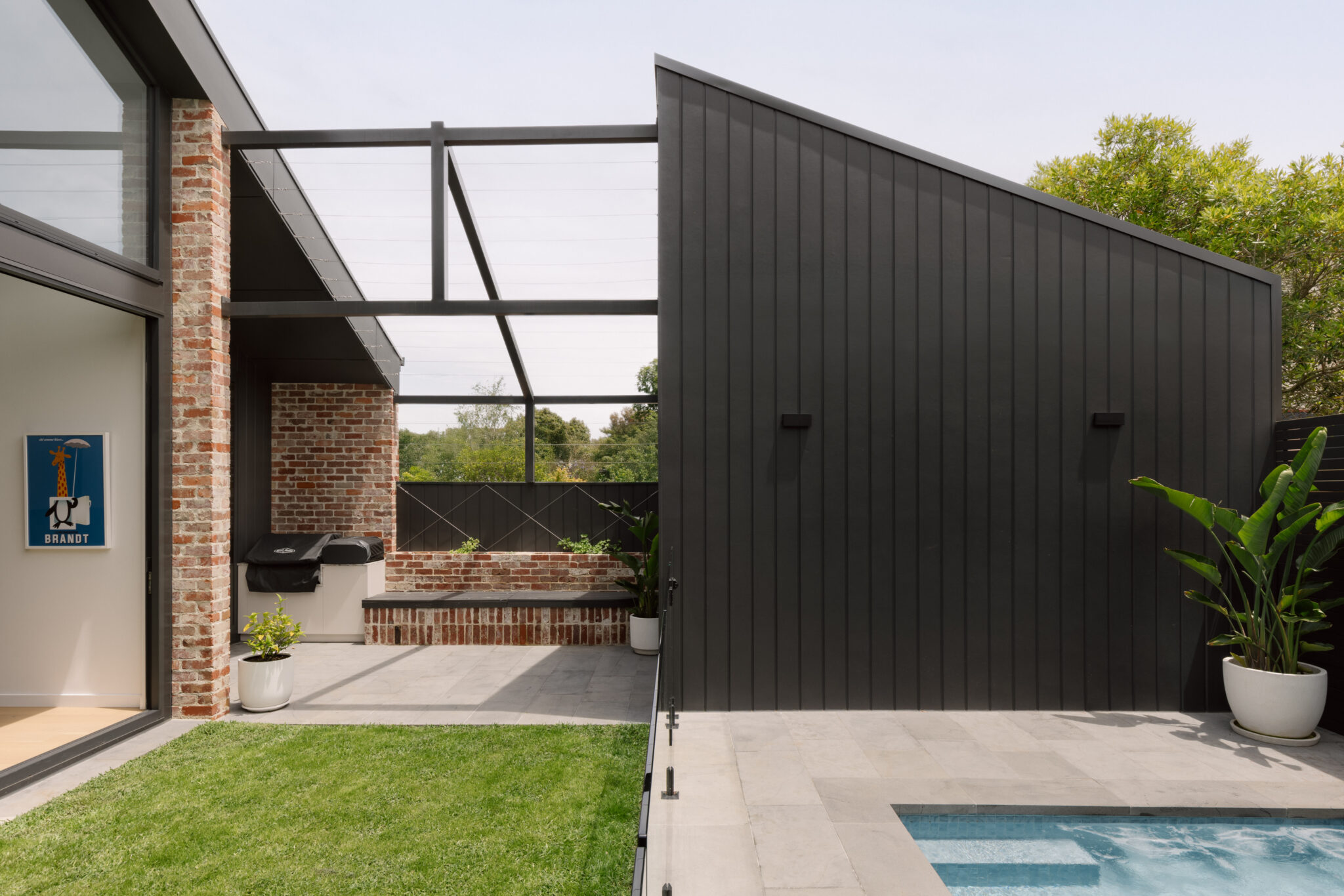 The rear gabled extension mirrors the original roofline but establishes striking contrast through charcoal vertical battens and lightweight shiplap cladding. Recycled red brick details create material dialogue between past and present, while high bay windows flood living areas with dappled light.