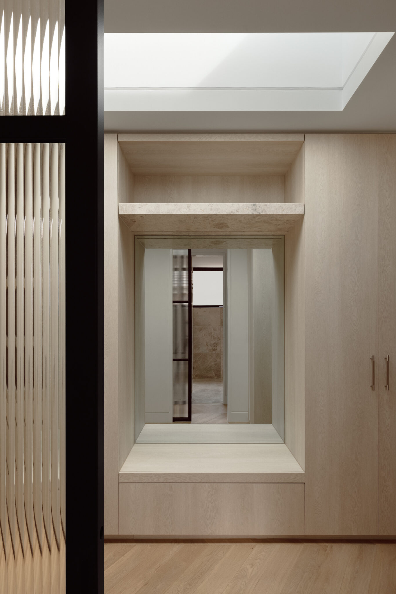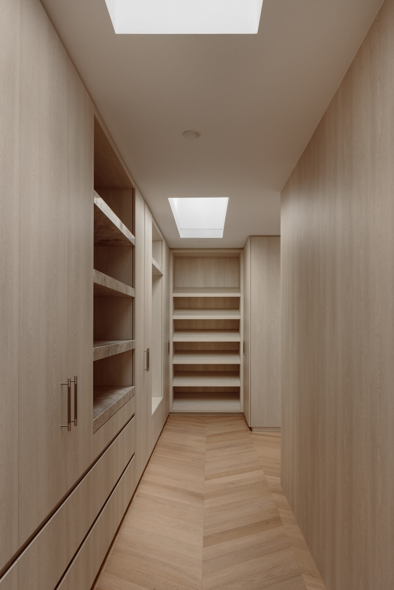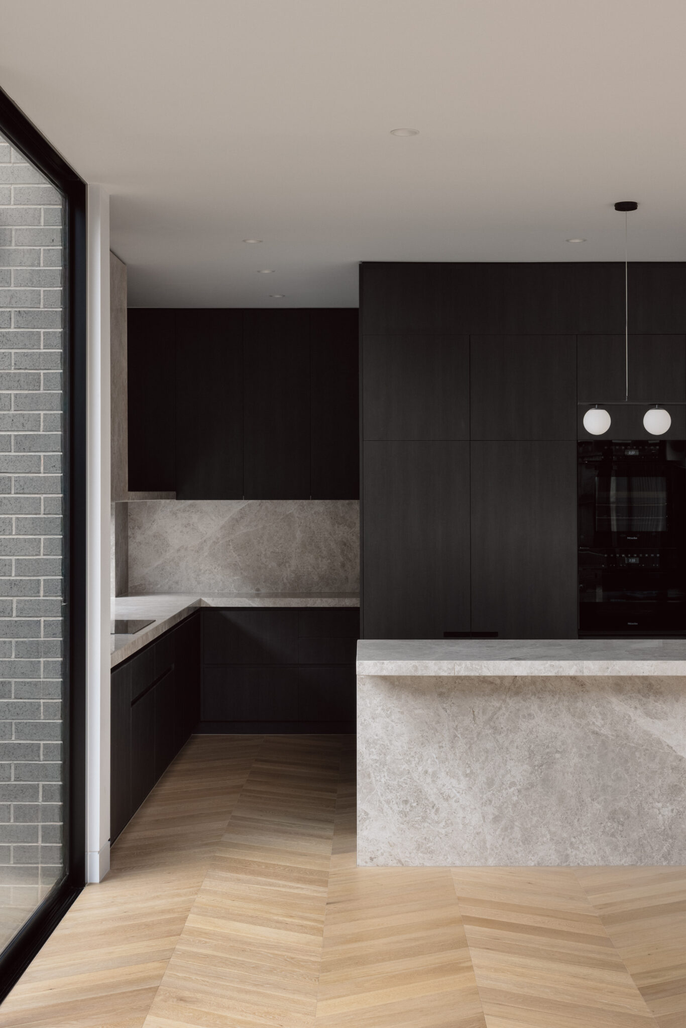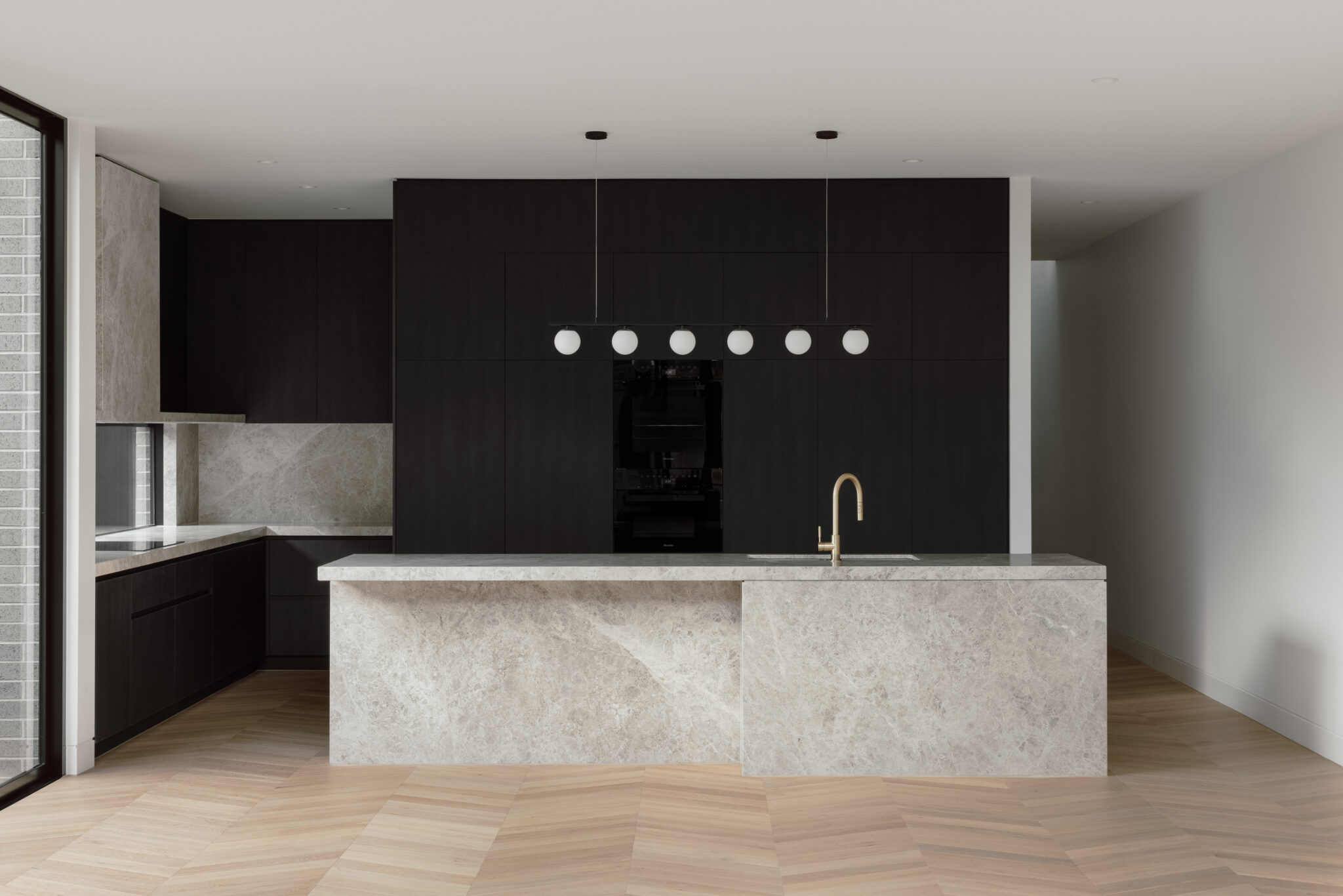 Dramatic raked canopies and cathedral ceilings create extraordinary volume, while double-height New York-style voids flood interiors with natural light. Petersen D91 bricks establish rich contrast against existing clinker brick homes, complemented by off-white render, natural timber, and refined metal detailing.